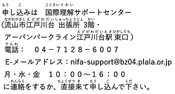 | ●1年に1回ずつ体験学習と日本語のスピーチ発表会を行っています。 ●子供向けには教育委員会からの依頼で小・中学校に出張して日本語を教えています。 |